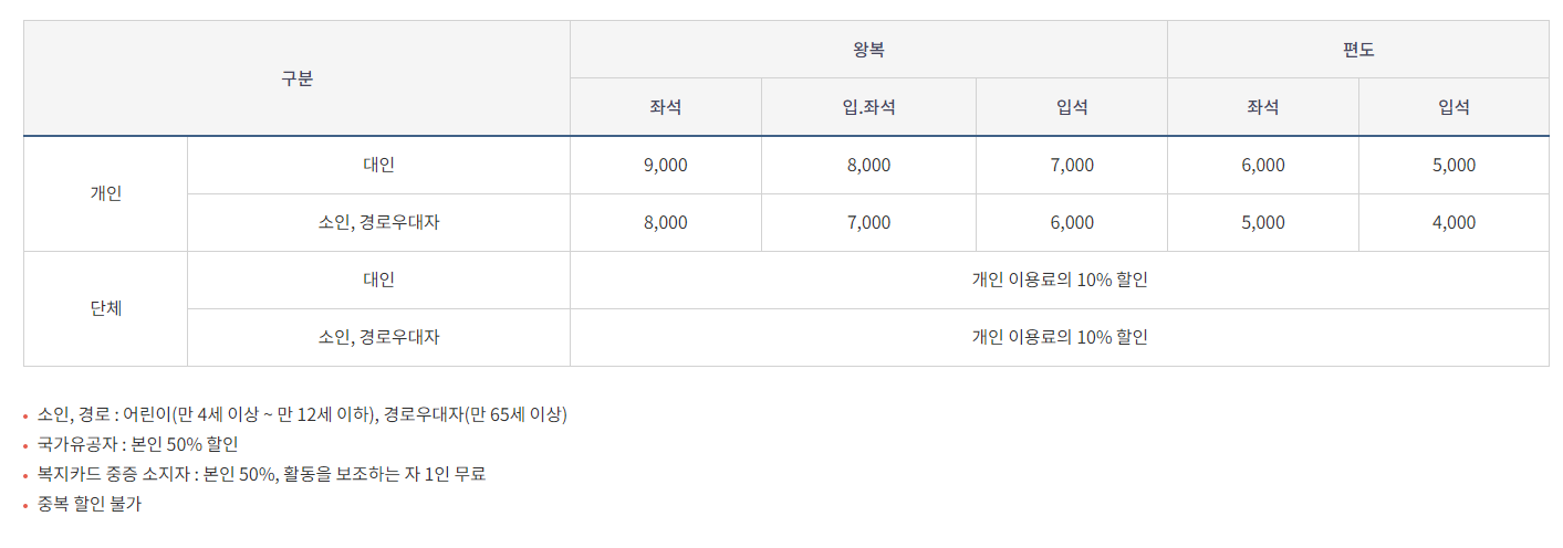 ◾이용요금 : 왕복-대인 9,000원, 소인(경로포함) 8,000원 / 편도 -대인 6,000원 / 소인(경로포함) 5,000원
