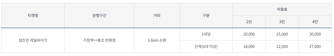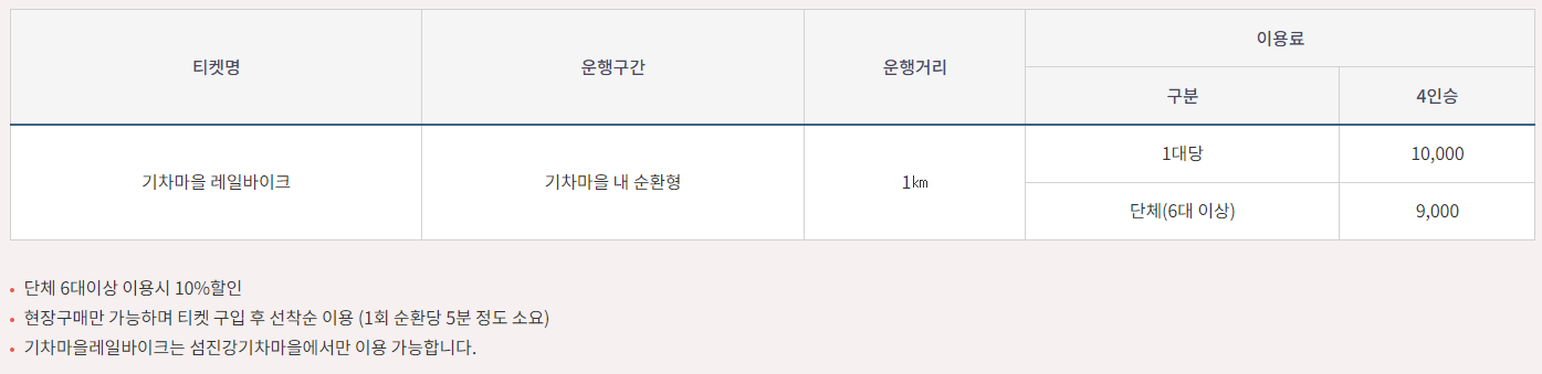 섬진강 기차마을에서는 증기기관차, 기차마을 레일바이크, 섬진강 레일바이크를 만날 수 있습니다. 기차 탑승 요금은 기차별 상이하므로 아래 표를 참고해주시면 됩니다.