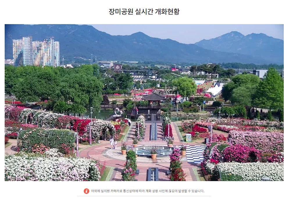 장미공원 실시간 개화 모습이 궁금하신 분은 아래 사진을 클릭하시면 야외에 설치된 카메라로 장미공원 실시간 개화현황 확인 가능합니다.