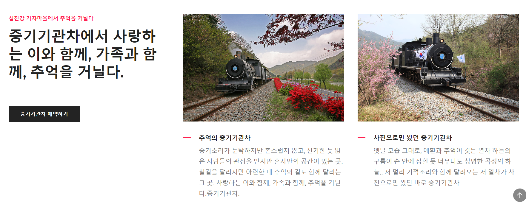 ◾ 증기기관차 / 기차마을 레일바이크 / 섬진강 레일바이크는 사전 예약 후 이용할 수 있습니다.