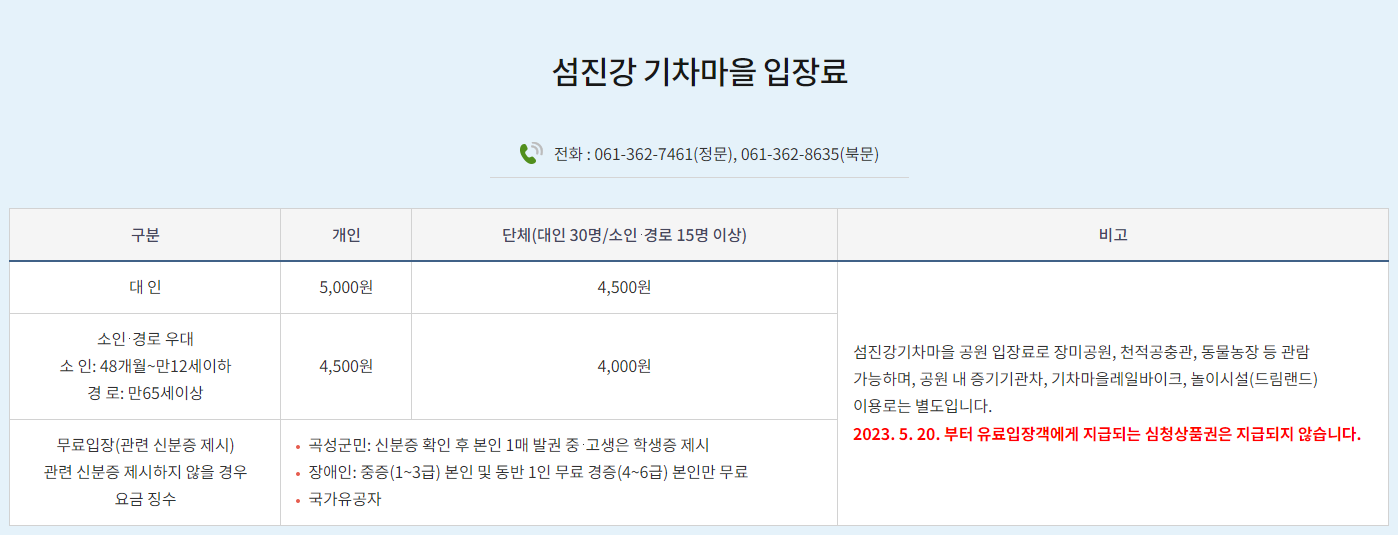 ❌ 공원 내 증기기관차, 기차마을 레일바이크, 섬진강 레일바이크, 놀이시설(드림랜드)은 별도 요금입니다.