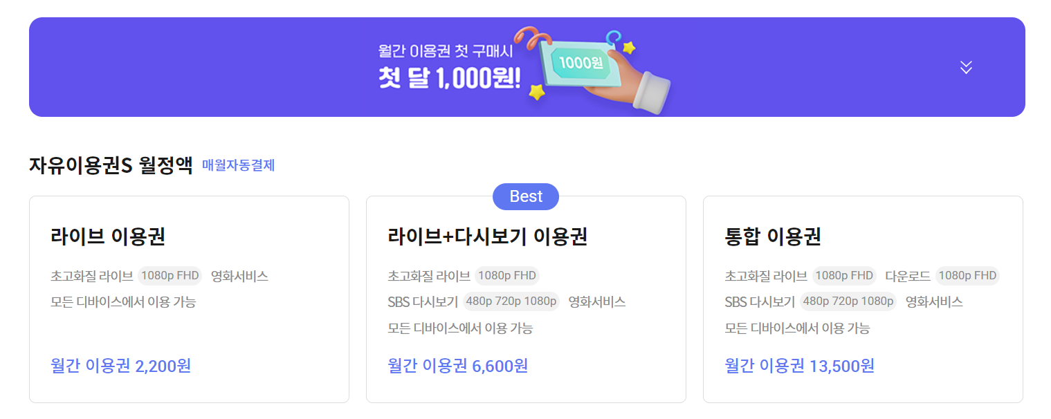월간 이용권 첫 구매시 첫 달 1,000원 이벤트를 진행하고 있습니다. 이후 월간이용권 매달 2,200원 결제됩니다.
