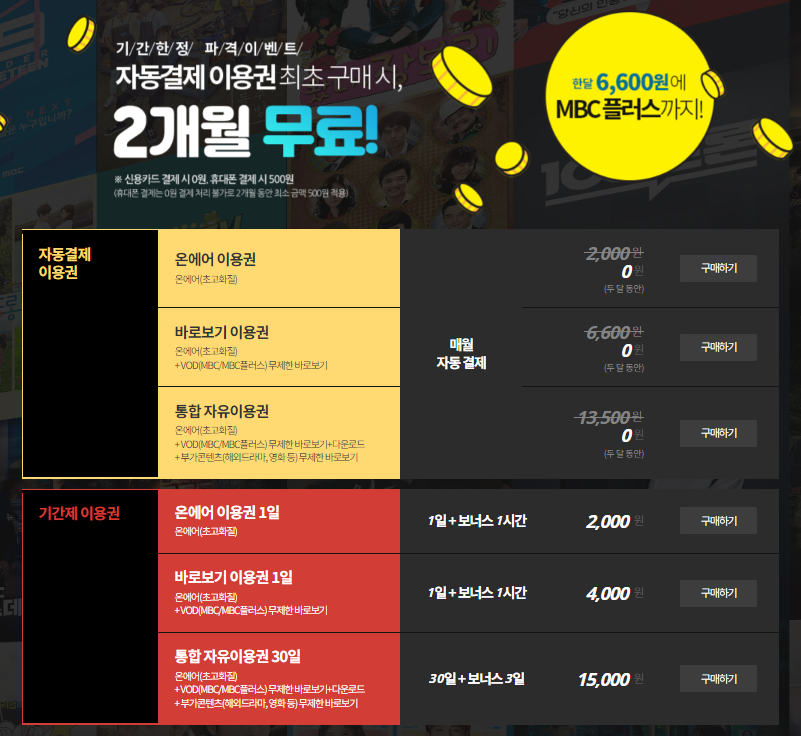 현재 이벤트로 이용권 최초 구매시 2개월 무료 이벤트 진행중입니다. 신용카드 결제 시 0원이지만 휴대폰 결제 시 정책상 0원 결제 처리 불가로 최소금액인 500원은 결제하셔야 합니다. 이번달 아시아 월드컵 예선을 위해 2개월간 무료로 이용한 후 추후 자동결제 여부는 본인이 선택하시면 되겠습니다.
