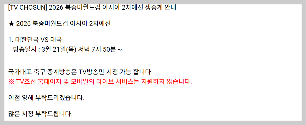 TV조선은 6월 11일 중국전을 생중계합니다. 저번 태국전 때 홈페이지 공지사항 내용(아래 사진)을 보면 TV조선에서는 국가대표 축구 중계방송은 TV방송으로만 시청 가능하며 홈페이지 온에어나 모바일 시청은 지원하지 않습니다. TV로만 중계 시청이 가능하기 때문에 채널번호를 알아두셔야 합니다.