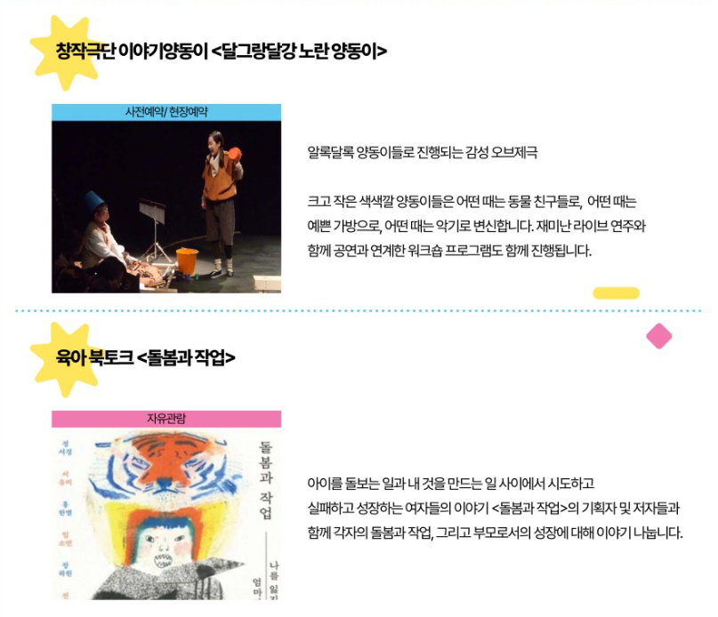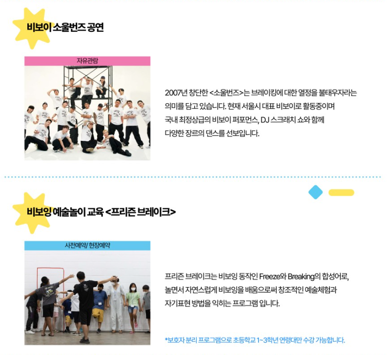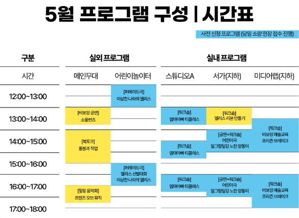 ◾실내 프로그램은 스튜디오A와 서가(지하), 미디어랩(지하)에서 다양한 워크숍과 공연이 진행됩니다. 엄마아빠 티클래스, 앨리스 리본 만들기, 어린이극(달그랑달강 노란 양동이), 비보잉 예술교육 프리즌 브레이크로 구성되어 있습니다.