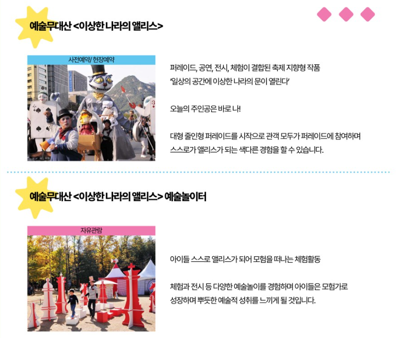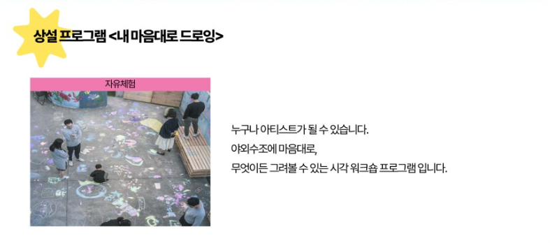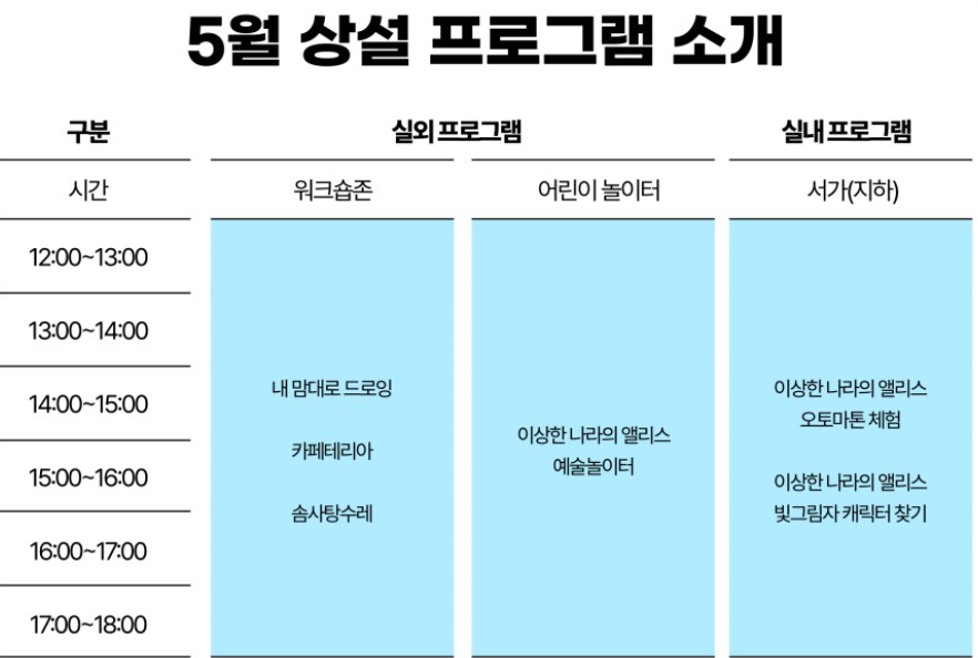✔️ 내 맘대로 드로잉, 카페테리아, 솜사탕수레, 이상한 나라의 앨리스(예술놀이터, 오토마톤 체험, 빛그림자 캐릭터 찾기)로 구성되어 있습니다.