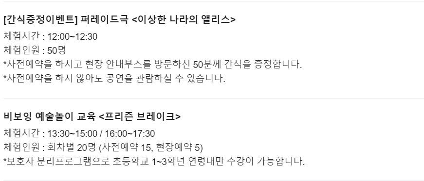 체험과 대형 공연관람 전체 무료로 진행하기 때문에 아이들에게 좋은 경험이 될 것 같습니다.