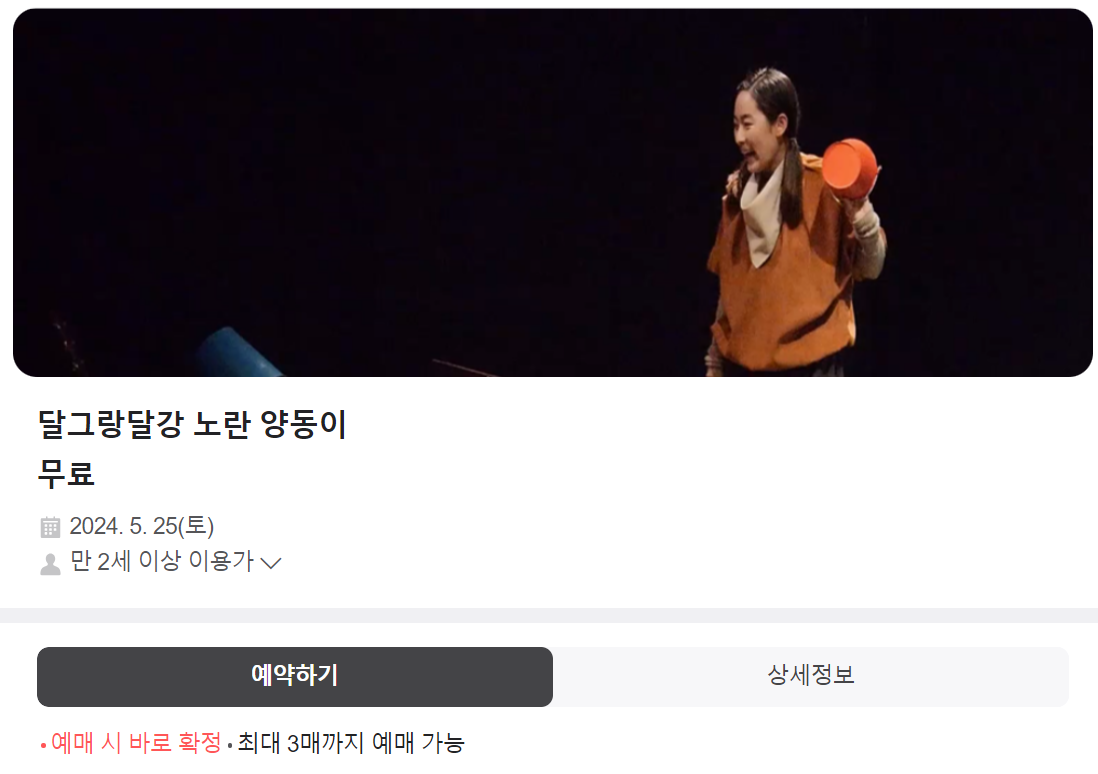 ◾만 2세부터 관람가능한 연극 '달그랑달강 노란 양동이'는 회차별로 50명(사전예약 30명, 현장예약 20명)으로 총 100명이 참여가능하기 때문에 즐거운 관람되시기 바랍니다.