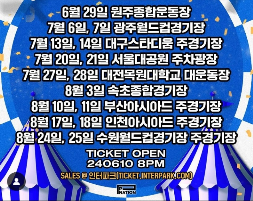 현재 티켓 예매 일정만 공개되었기 때문에 공연 개최 지역, 날짜, 시간, 장소, 게스트 라인업 등에 대한 정보가 없습니다. 아래 인스타를 통해 가장 빠르게 확인할 수 있습니다.