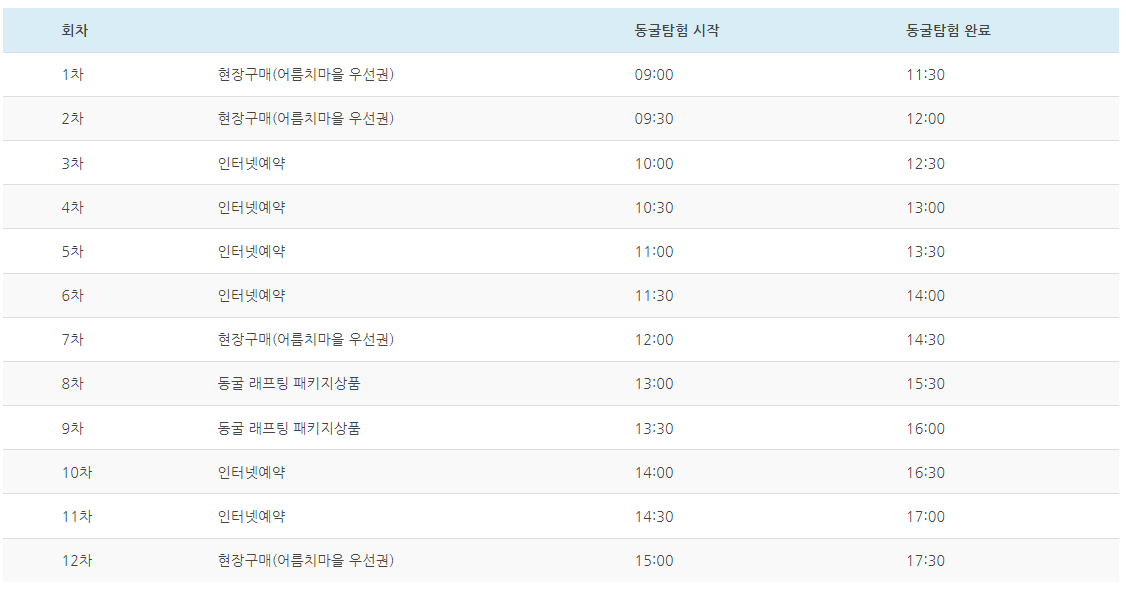 🚫 만 65세 이상 노인 및 6세 이하 어린이, 중증장애자는 탐험동굴 특성상 관람을 제한합니다.