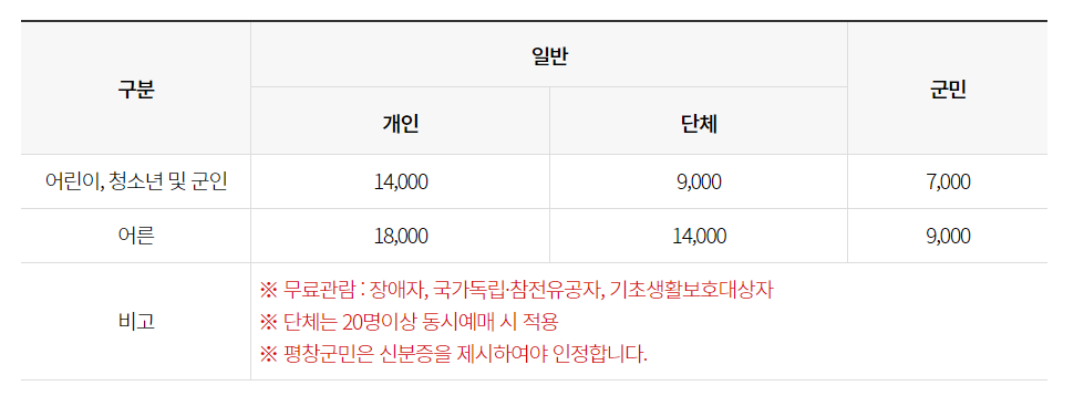 ✔️ 이용요금은 대인 18,000원, 소인(어린이, 청소년) 14,000원, 군인 14,000원입니다.