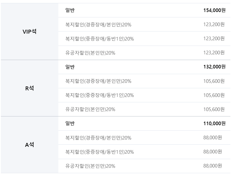 ✔️ 휠체어석은 기획사 전화예매를 통해서만 예매가 가능하며, 동반인도 티켓을 구매하셔야 합니다. (1577-3850, 현장수령)