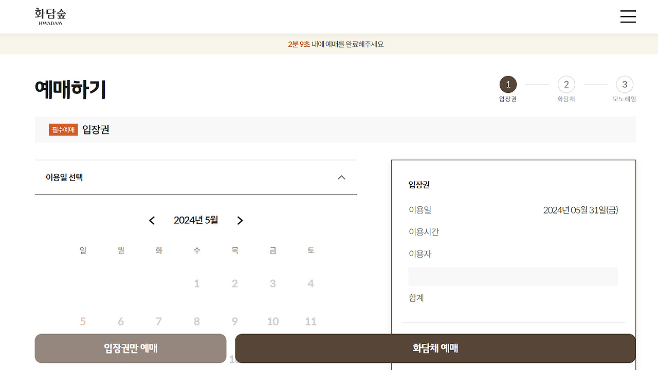 3. 화담숲 입장권 예매 후 화담채, 모노레일 순차적 예매 진행