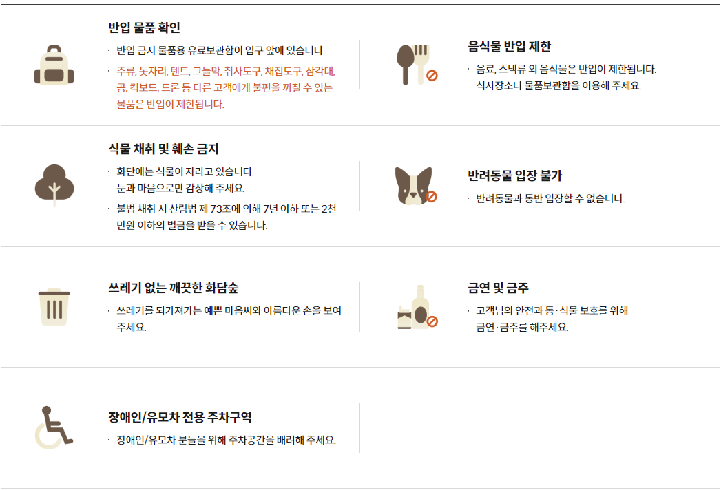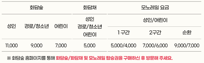 • 입장권, 화담채, 모노레일은 각각 이용요금이 부과됩니다.