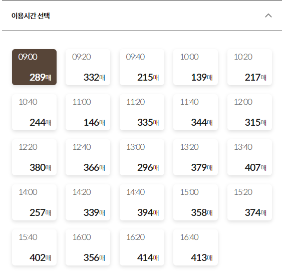 • 이전에 선택한 날짜와 시간에 남아있는 예매표 수량이 없을 경우(아래 사진 참고) 이용이 불가합니다. 다시 예매창으로 돌아가셔서 입장권 시간대를 변경하신 후 다시 확인하시면 됩니다.