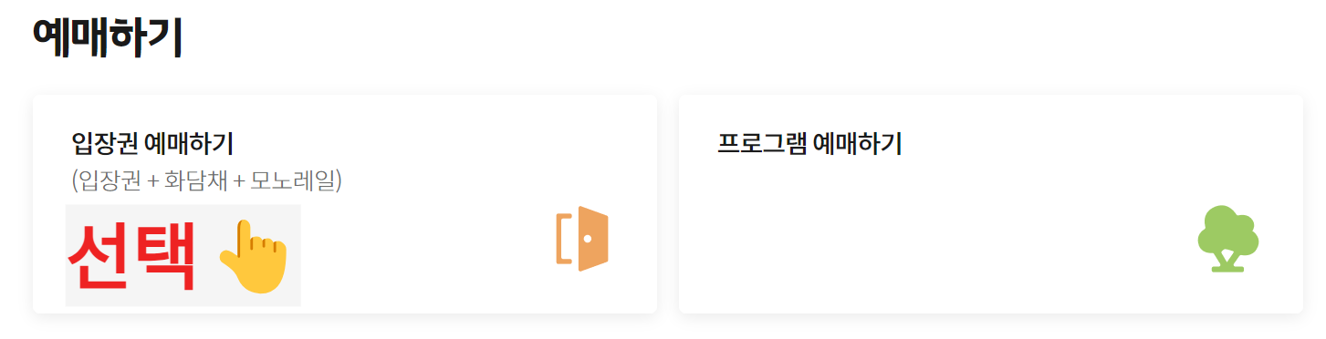 1. 화담숲 홈페이지 접속👆 ▶️ 입장권 예매하기(입장권+화담채+ 모노레일) 선택