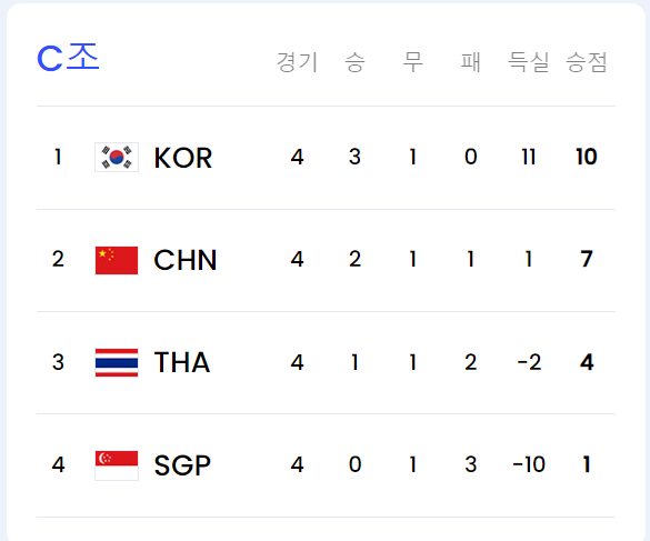 현재 대한민국은 3승 1무(승점 10점)로 C조 1위를 달리고 있지만 2위는 중국(승점 7점), 3위는 태국(승점 4점), 4위는 싱가포르(승점 1점)입니다.